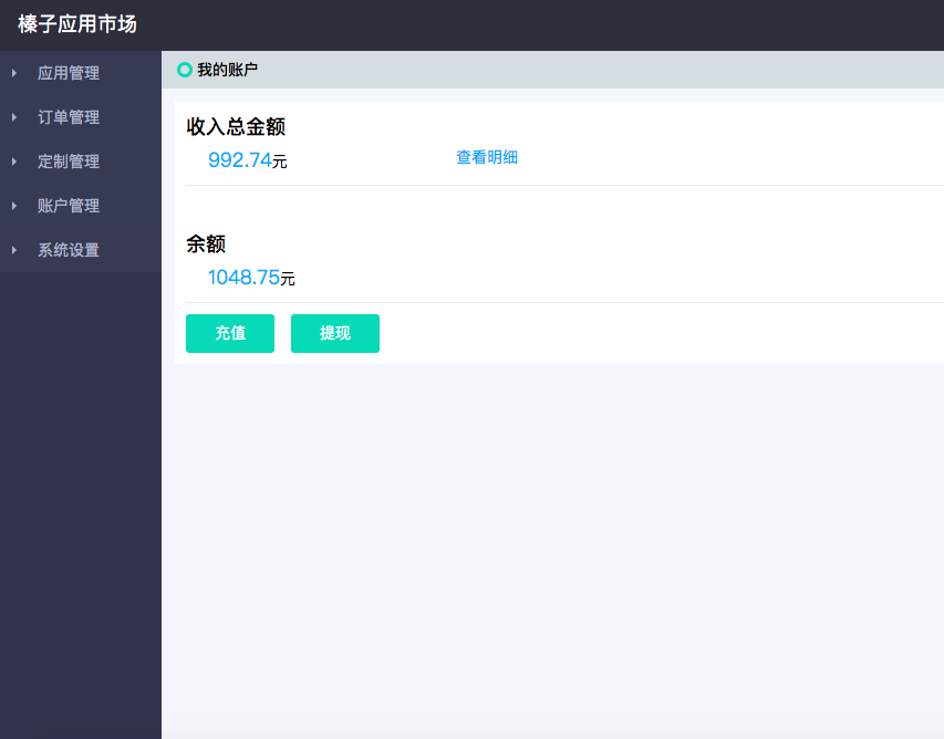 注册完毕后,登录http://market.zhenzikj.com/admin/login.html,进入开发者控制台,在这里可以管理应用、订单、账户等所有操作: