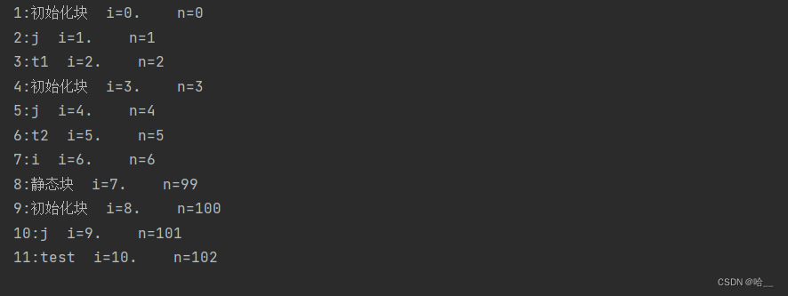 现在你是否清楚了前三行输出结果是怎么来的了吗?这前三行的结果都是t1进行初始化时非静态块和非静态变量的执行结果。