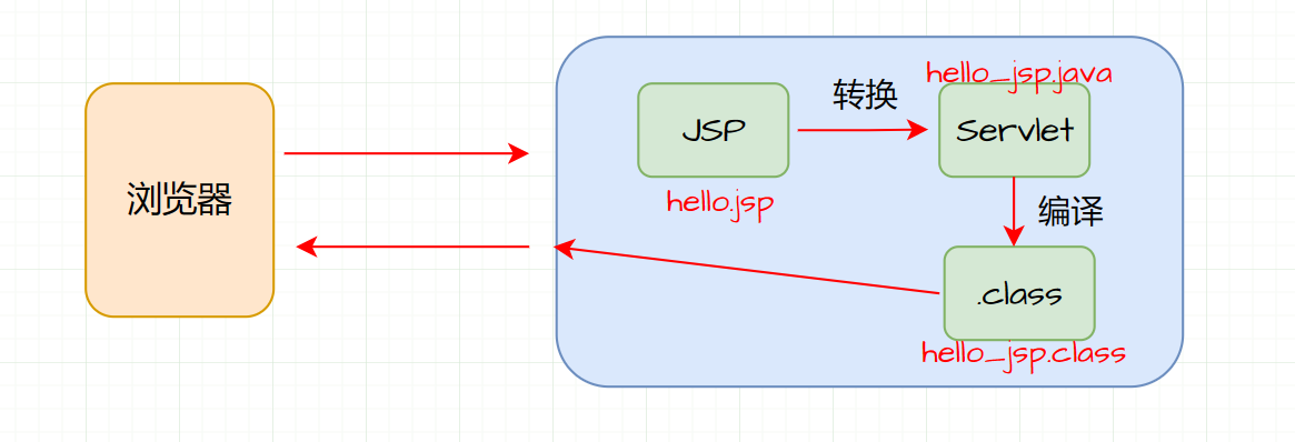 在上面的例子中,浏览器第一次访问 heelo.jsp 页面时,Tomcat 会将 hello.jsp 装换为名为 hello_jsp.java 的一个Servlet, 然后 这个 Servlet 会被 TomCat 编译为字节码文件 hello_jsp.class 。TomCat 会执行该字节码文件向外提供服务。