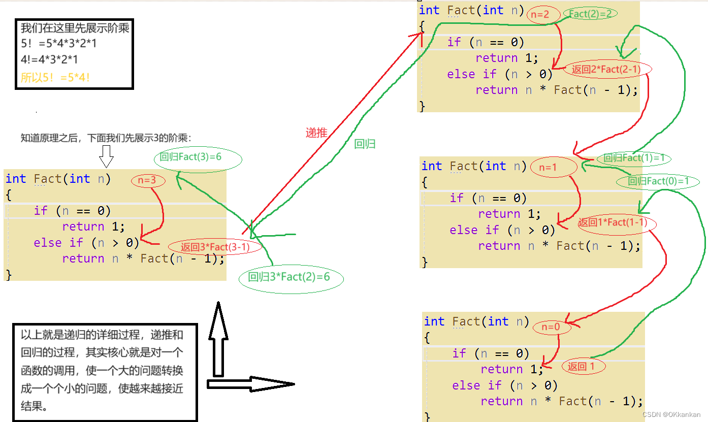 上述代码就给大家演示了一遍比较基本的函数递归,我们可以看到如果n大于0的话,就会返回n*Fact(n-1),所以就相当于不断的调用Fact函数,如果大家还是不太理解,下面我们用一张图帮助大家进一步理解: