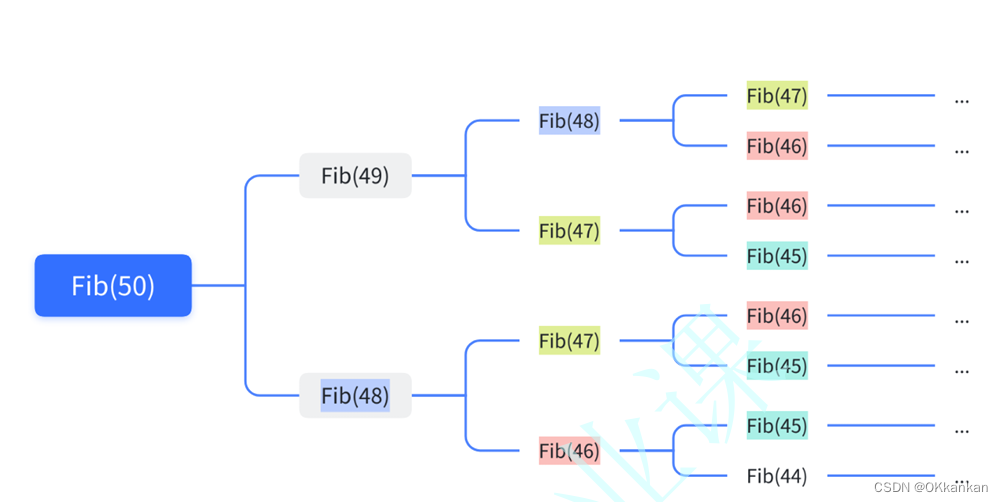 当我们n输⼊为50的时候,需要很长时间才能算出结果,这个计算所花费的时间,是我们很难接受的,这也说明递归的写法是非常低效的,那是为什么呢?其实递归程序会不断的展开,在展开的过程中,我们很容易就能发现,在递归的过程中会有重复计算,而且递归层次越深,冗余计算就会越多。