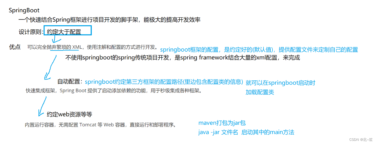 随着Spring发展的越来越火,Spring也慢慢从一个小而精的框架变成了,一个覆盖面广大而全的框架,另一方面随着新技术的发展,比如nodejs、golang、Ruby的兴起,让Spring逐渐看着笨重起来,大量繁琐的XML配置和第三方整合配置,让Spring使用者痛苦不已, 因为在思考 Spring 特性配置和解决业务问题之间需要进行思维切换,所以写配置挤占了写应用程序逻辑的时间。