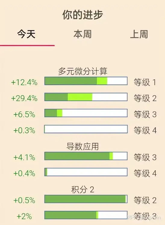 要谈起复习效率,就离不开知能行的一些额外功能了。我觉得知能行最棒的地方不只是它强大的刷题功能,还有他的数据可视化功能。我们平常对自己的数学能力大概多少,大多时候都是在拍脑袋猜。但如果你用上了知能行,它会以数据说话,比如你的学习进度到哪了,知能行就有个进度条给你看: