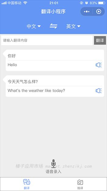 翻译小程序,几乎支持所有语言,支持语音输入和手动录入, 支持翻译后语音合成播放。